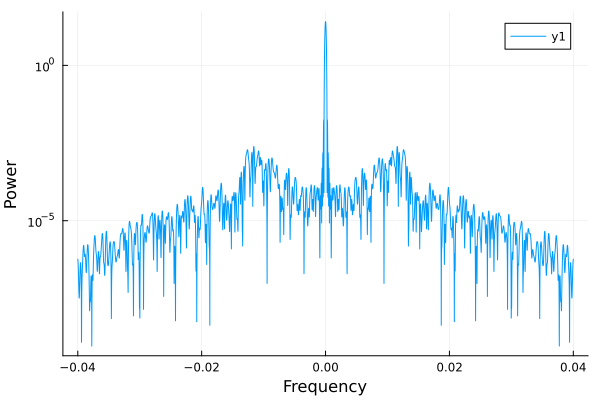 plot(freqω, psd; yscale=:log10, xlabel="Frequency", ylabel="Power")