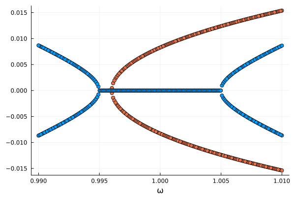 scatter!(ωrange, sidebands2; xlab="ω", legend=false, c=:white, markerstrokewidth=0, ms=2)