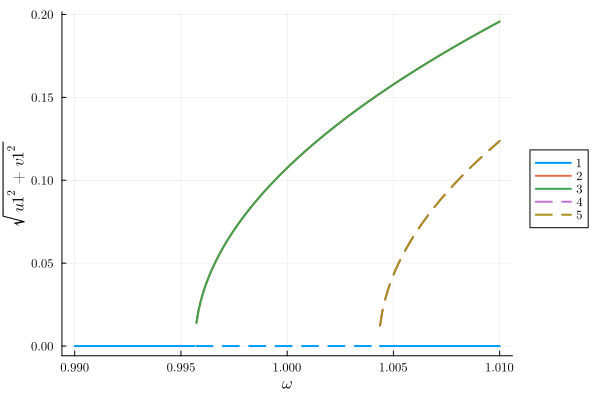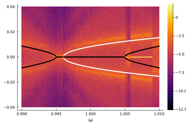 Differential(T)(v1(T))*γ + (1//2)*v1(T)*λ - (2//1)*Differential(T)(u1(T))*ω - u1(T)*γ*ω - v1(T)*(ω^2) + v1(T)*(ω₀^2) + (3//4)*(u1(T)^2)*v1(T)*α + (3//4)*(v1(T)^3)*α ~ 0We can compute the steady states of the system using HomotopyContinuation.jl.