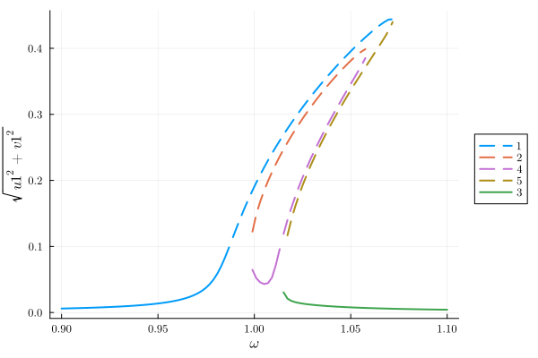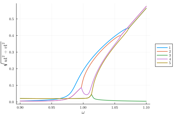 Differential(T)(v1(T))*γ + (1//2)*v1(T)*λ - (2//1)*Differential(T)(u1(T))*ω - u1(T)*γ*ω - v1(T)*(ω^2) + v1(T)*(ω₀^2) + (1//4)*(u1(T)^2)*Differential(T)(v1(T))*η + (3//4)*(u1(T)^2)*v1(T)*α + (1//2)*u1(T)*v1(T)*Differential(T)(u1(T))*η + (3//4)*Differential(T)(v1(T))*(v1(T)^2)*η + (3//4)*(v1(T)^3)*α - (1//4)*(u1(T)^3)*η*ω - (1//4)*u1(T)*(v1(T)^2)*η*ω ~ 0The output of these equations are consistent with the result found in the literature. Now we are interested in the linear response spectrum, which we can obtain from the solutions to the averaged equations (rotating frame) as a function of the external drive, after fixing all other parameters in the system. A call to get_steady_states then retrieves all steadystates found along the sweep employing the homotopy continuation method, which occurs in a complex space (see the nice HomotopyContinuation.jl docs)