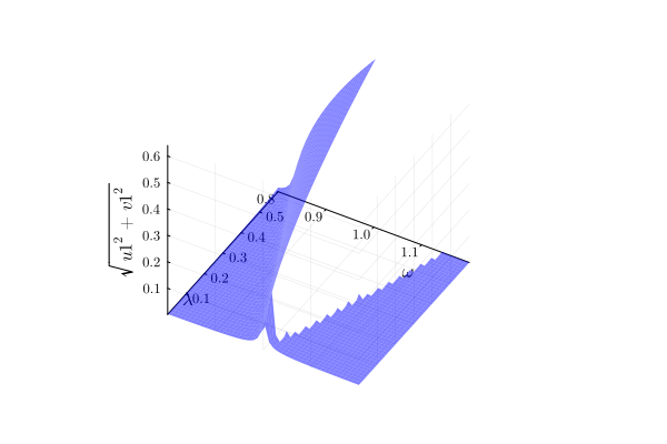 plot(result, "sqrt(u1^2 + v1^2)"; class=["physical", "large"], style=:dash)