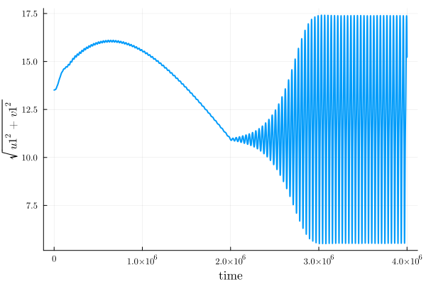 time_evo = solve(time_problem, Tsit5(), saveat=100);Inspecting the amplitude as a function of time,