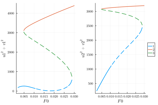 -(2//1)*Differential(T)(u2(T))*ω + Differential(T)(v2(T))*γ + (2//1)*J*v2(T)*ω0 - (2//1)*J*v1(T)*ω0 - v2(T)*(ω^2) + v2(T)*(ω0^2) - u2(T)*γ*ω + (3//4)*(v2(T)^3)*α + (3//4)*v2(T)*(u2(T)^2)*α ~ 0Solving for a range of drive amplitudes