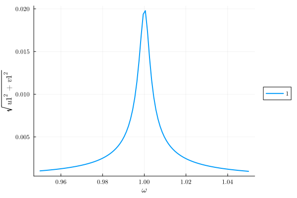 plot(result, x="ω", y="sqrt(u1^2 + v1^2)");