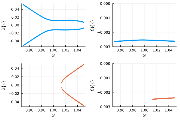 [-0.0023837749491295024 - 0.048814521365088855im, -0.0023837749491295024 + 0.04881452136508884im]Using the PlotsExt.jl extension, one can quickly compute and plot the eigenvalues as follows