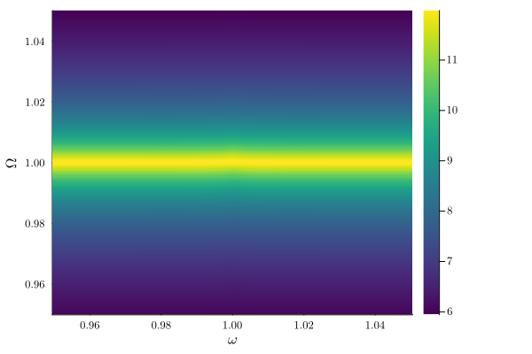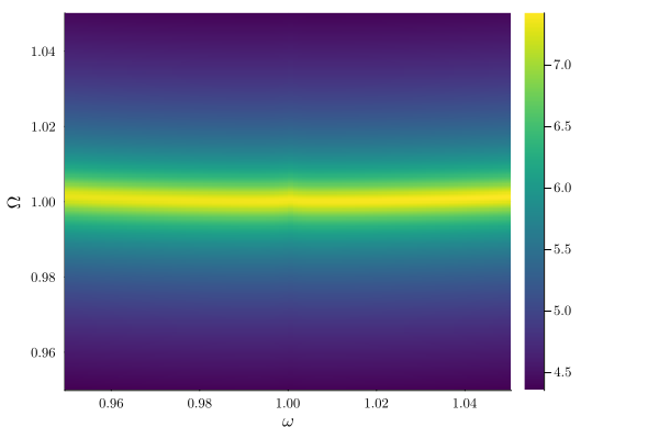 plot_linear_response(result, x, 1, Ω_range=range(0.95, 1.05, 300), logscale=true)