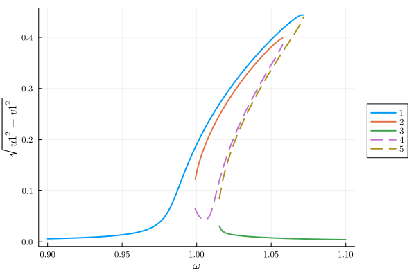 Clearly when evolving from u0 = [0., 0.], the system ends up in the low-amplitude branch 2. With u0 = [0.2, 0.2], the system ends up in branch 3.