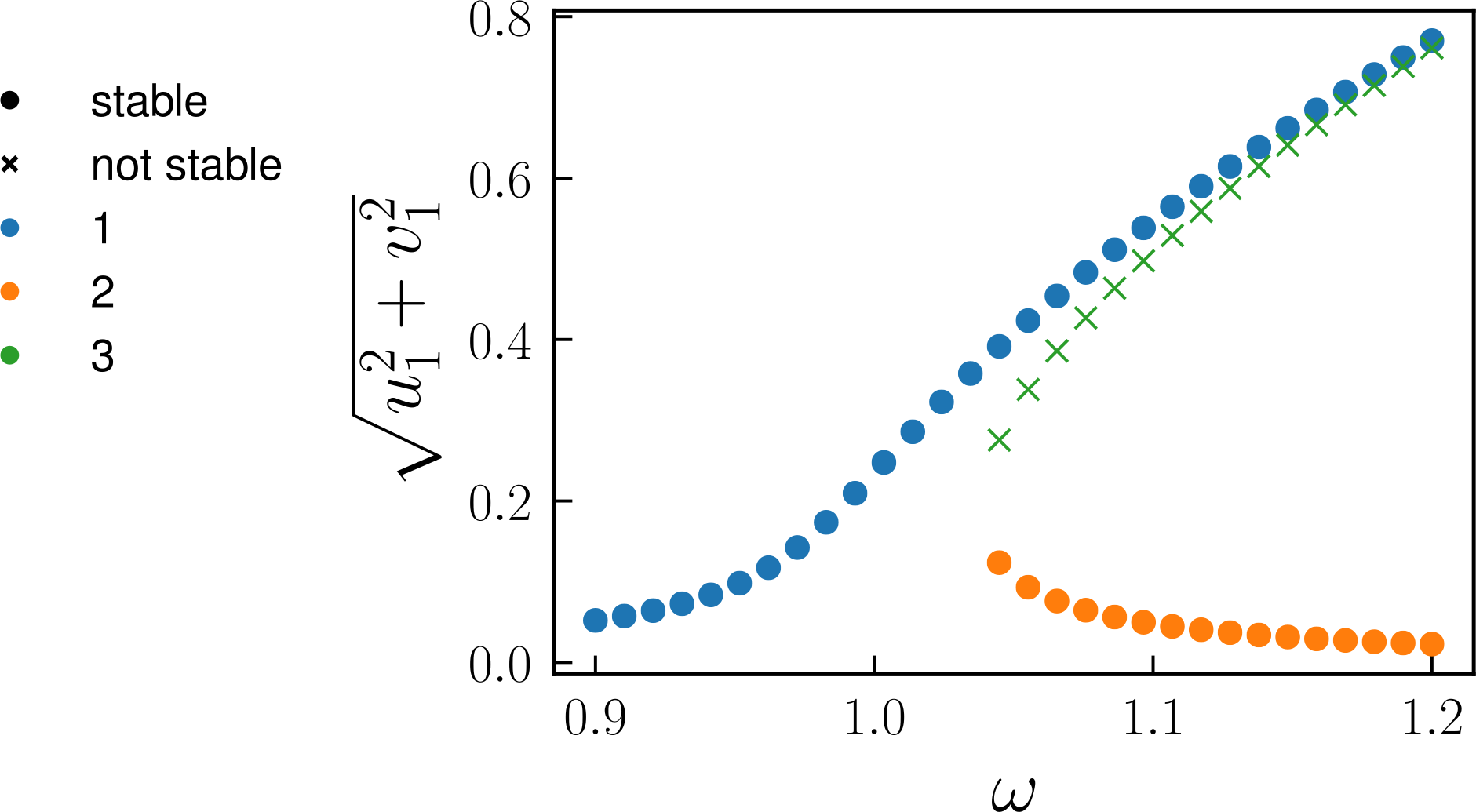 Classes: stable, physical, Hopf, binary_labelsThe algorithm has found 3 solution branches in total (out of the hypothetically admissible $3^{2} = 9$). All of these are real – and thefore physically observable – for at least some values of $\omega$. Only 2 branches are stable under infinitesimal perturbations.